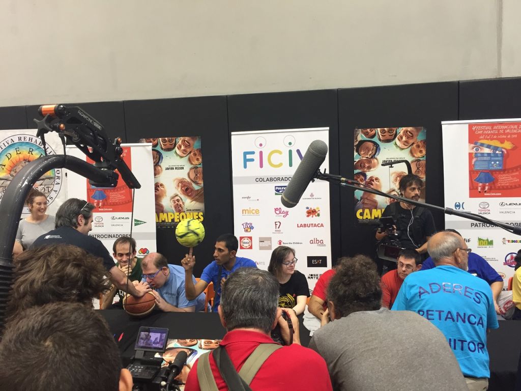 Sergio Olmos y Jesús Lagos, actores en la película de Campeones, respondieron a unas preguntas para la prensa y ambos coincidían en que esta experiencia es incluso más divertida que los partidos durante el rodaje. Aunque Sergio reconoce que no está acostumbrado a jugar con tanta gente mirándoles, explica que sí que se esperaba el éxito de este evento en Valencia, y es más, que sí esperaba que la película tuviera tanta popularidad, pero pese a esto declara que no pensaban que iba a llegar donde ha llegado, que fuera a llegar a los Óscar. Ante la pregunta de ser actor o jugador de baloncesto responde que “preferiría ser jugador de baloncesto, porque hay que darle oportunidad a otras personas con discapacidad”. Jesús también quería destacar que lo importante había sido divertirse todos juntos jugando con el gran equipo que era ADERES y que habían estado genial y riéndose durante toda la tarde.