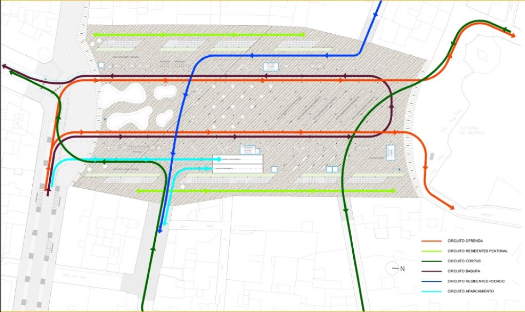 El resto de las actuaciones que recoge el proyecto afectan a la instalación de mobiliario urbano accesible; la previsión del espacio necesario para la ubicación de un monumento fallero con pavimento adecuado; y la zona reservada para la celebración de mercadillos (especialmente la tradicional escuradeta), que tendrá instalaciones eléctricas en subsuelo y toldos desmontables. A todo ello se suman los espacios destinado a terrazas para hostelería, la incorporación de dos fuentes bebedero, el soterramiento de los contenedores de residuos sólidos, una caseta de información turística, quiosco de prensa y previsión de aseos públicos.