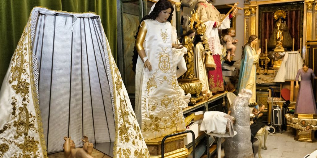 Pedro José Arrúe explica que el principal trabajo ha sido la reparación del armazón del manto, que se había oxidado y se ha sustituido por uno nuevo de acero que ahora permitirá que este luzca en su caída con mayor volumen, imitando la imagen peregrina con la forma piramidal y dignificando el conjunto. Tanto el manto, de Enrique Marzal, como las vestimentas se han limpiado en seco para no dañar la seda, eliminando las arrugas cuidadosamente para ensalzar los bordados y reparando los daños. El fajín, regalo del capitán general de València, ha precisado también de una restauración a fondo.