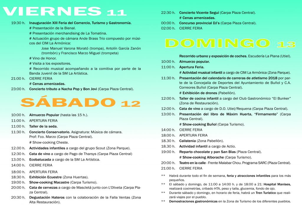 El edil del ramo buñolense recuerda algunos aspectos destacados con los que contará esta feria, “como el concierto del ganador de Operación Triunfo, Vicente Seguí; la presentación del último libro del periodista y escritor Màxim Huerta; un concurso de Djs; actuaciones musicales de las dos sociedades musicales del municipio; atracciones infantiles; y sobre todo, mucho comercio, grandes ofertas, y todo ello desde el excelente trato que ofrecen nuestros comerciantes”.