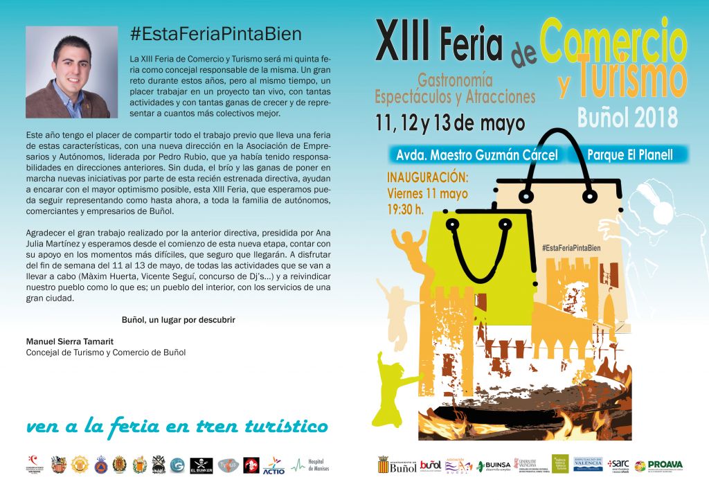 Manuel Sierra, concejal de Turismo y Comercio del Ayuntamiento de Buñol, ha resumido los actos promocionales que en los últimos días se han sucedido en torno a la XIII Feria de Comercio y Turismo, que tendrá lugar del 11 al 13 de mayo. Unos actos en los que no sólo se ha dado a conocer la programación íntegra de esta feria, sino también los numerosos atractivos culturales, como el Vivir de Cine y la Bienal de Música, que tiene este municipio de interior de la provincia de Valencia.