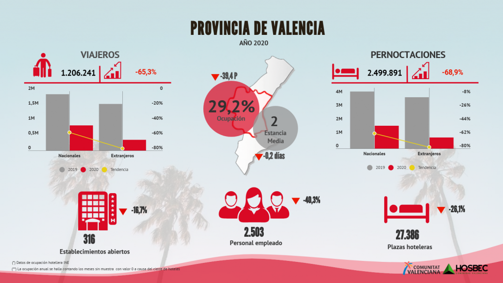 La actividad hotelera en la provincia de Valencia de este 2020 se ve afectada en un 68,9% con respecto a 2019. Este dato supone una caída del 65,3% en el número de turistas alojados en hoteles.