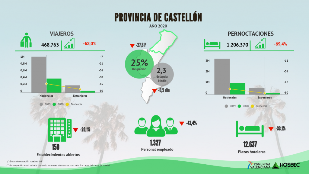 Castellón en su conjunto ha registrado de enero a diciembre 1.206.370 pernoctaciones, lo que supone un 69,4% menos con respecto a 2019.