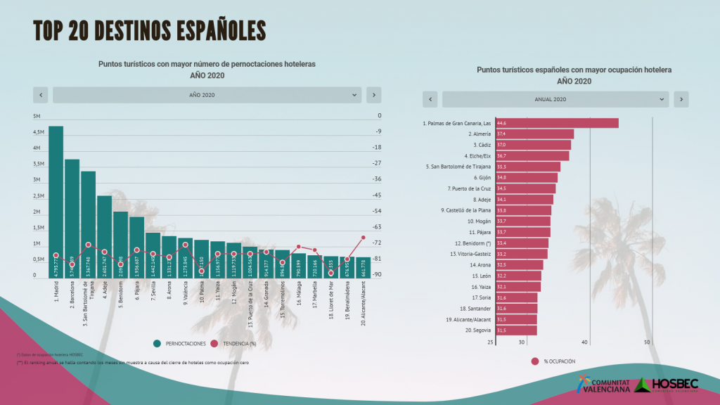 Lamentablemente todos los destinos del ranking de pernoctaciones muestran variaciones negativas respecto al año 2019. No obstante, a pesar del escenario tremendamente adverso tres destinos de la Comunitat Valenciana se encuentran entre estas primeras posiciones Benidorm (5) , Valencia ciudad (9) y Alicante ciudad (20).