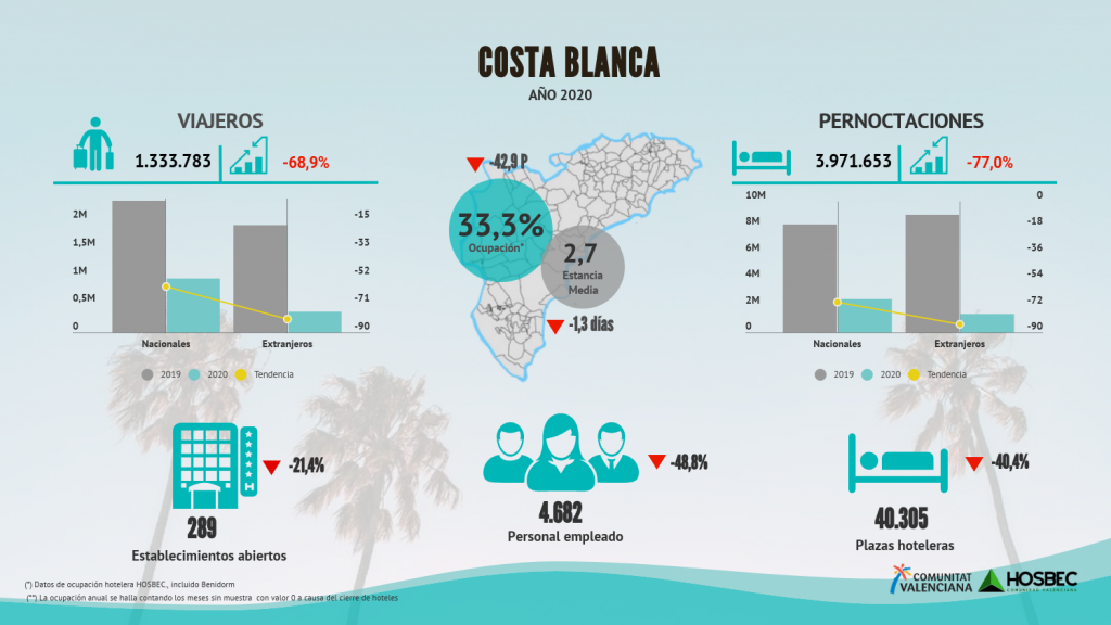 La Costa Blanca, en su conjunto, ha recibido un 68,9% menos de viajeros alojados en hoteles, lo que ha supuesto una reducción del 77% de las pernoctaciones hoteleras a lo largo de 2020.